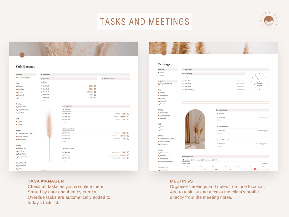 - Meetings - In-depth view of meetings for today, tomorrow, rest of the week, and rest of the month. Meetings are automatically synced throughout the template. Meeting template to record resources, write meeting notes, and add action items to the task list.