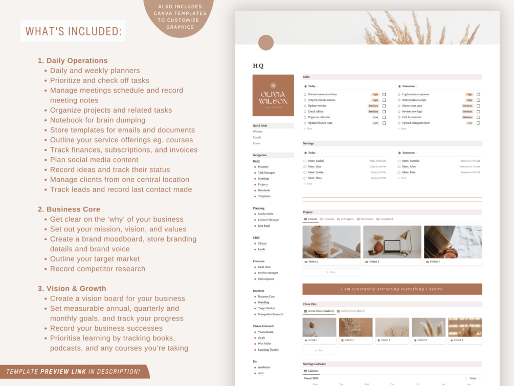 With the template, you can easily prioritize and check off tasks, prepare for meetings, manage invoices, track income and expenditure, manage clients and leads, and plan social media content. Plus, with the ability to record ideas and outline new projects or courses, you'll never lose sight of your business's next big thing.
