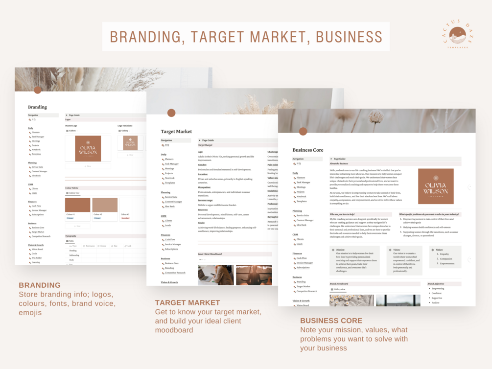 Get clear on the ‘why’ of your business with the template's guidance on identifying what problem you want to solve, your mission, vision, and values. The template will help you define your brand voice, identify your target market, and analyze your competition to ensure you stand out in your niche.